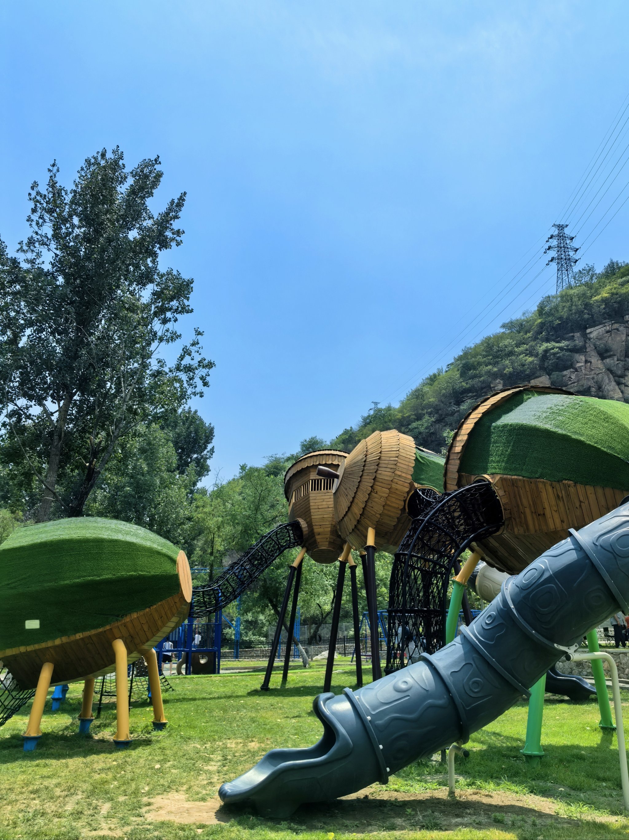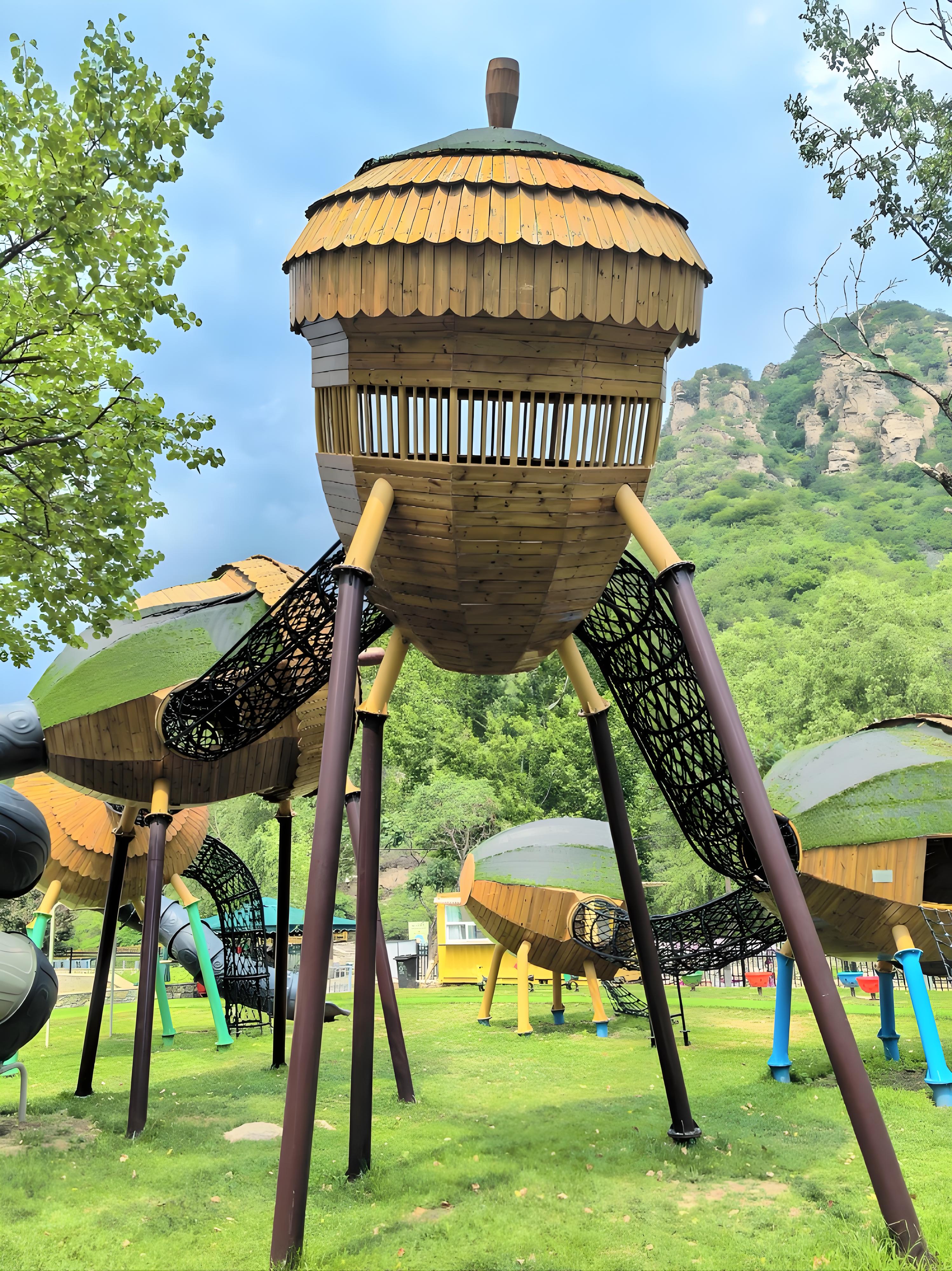 松果主题滑梯群:结合树屋造型,设置螺旋滑道、波浪滑道等趣味形态,模拟丛林穿梭体验;