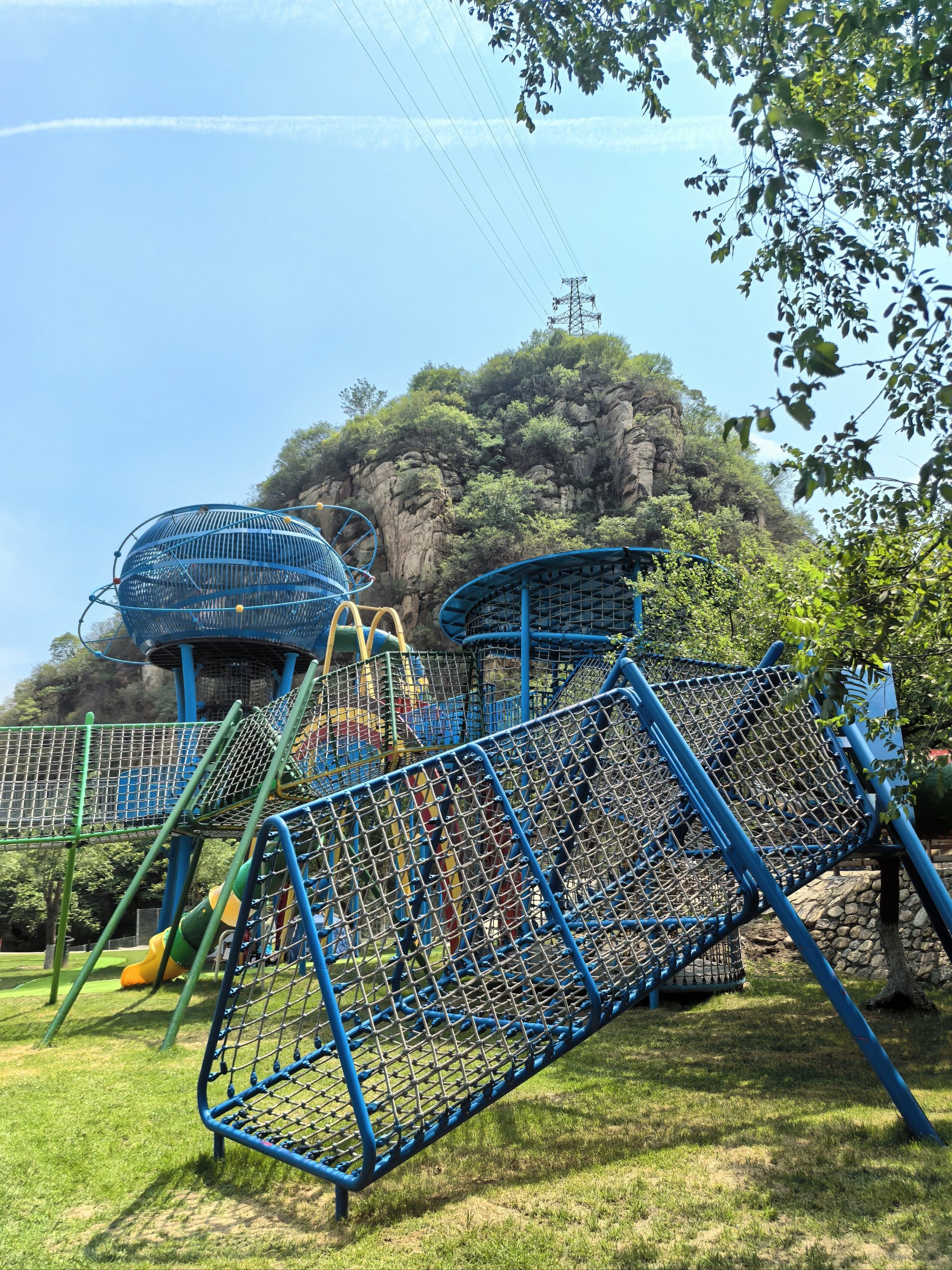 蹦床与秋千:分散布局于树荫下,兼顾安全性与趣味性。